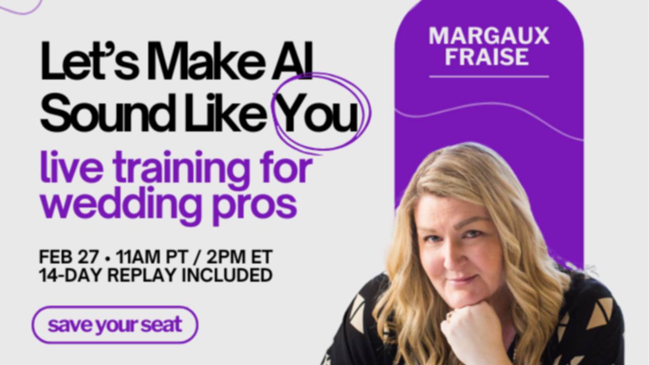This live session on Feb 27th (14-day replay access included) is for wedding pros who want AI support without losing their voice. Inside, Margaux walks you through how to train AI to reflect your tone, values, boundaries, and real-life client language — not generic marketing fluff. You’ll learn how to use your own emails, captions, consult language, and responses to create AI outputs that feel natural, confident, and on-brand. This is about clarity and consistency, not sounding robotic. Expect practical examples you can use immediately for inquiries, follow-ups, content, and client communication.