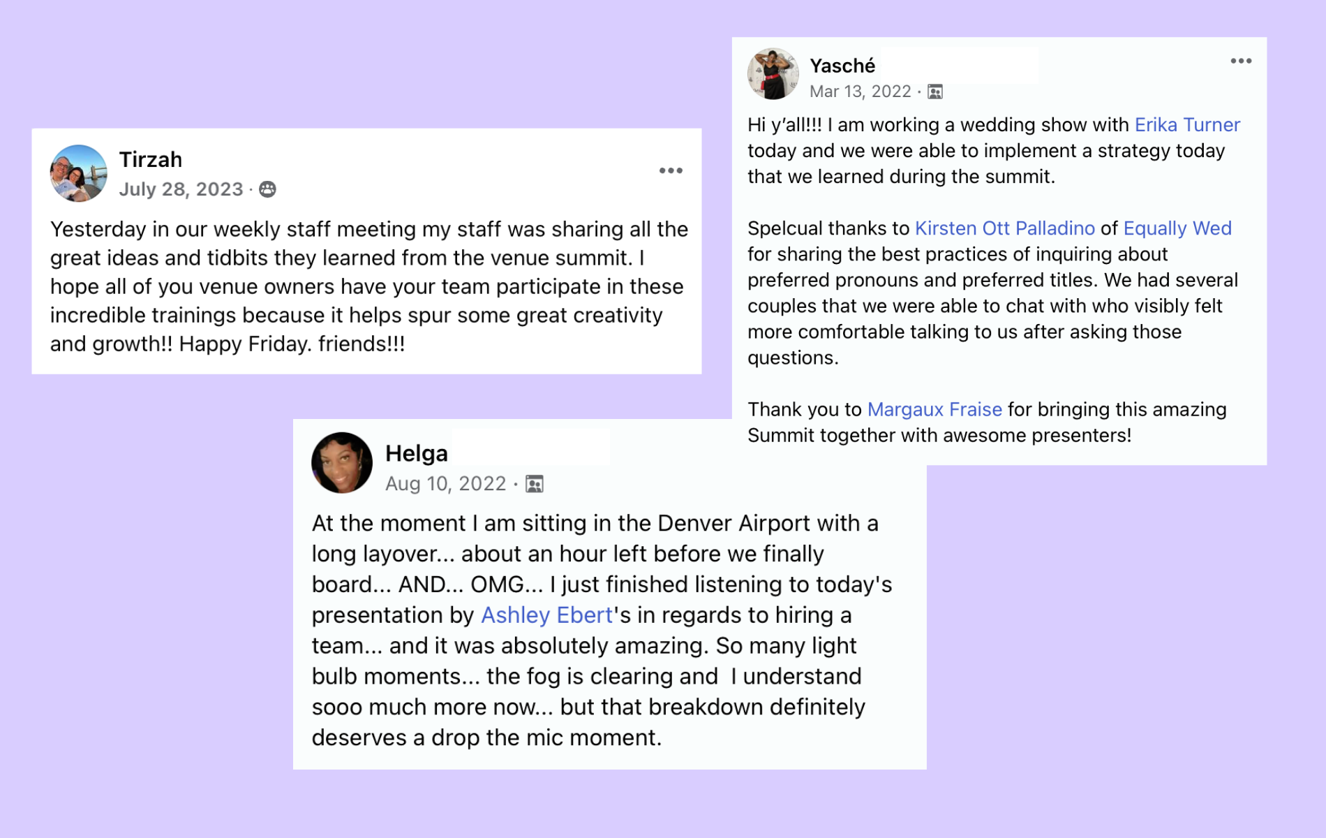 'Venues Tell All: Tales from the Top of the Booking Funnel' Reality: most couples book their venue first. Those who own and market venues have a lot to share about the current buying habits of couples, the extended sales cycle, in-person sales and vendor referrals. With panelists Tirzah Caffee, Mark Chapman and Shannon Tarrant